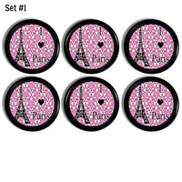 I love Paris Eiffel Tower on Hot Pink Damask Dresser Knobs, Cabinet Drawer Pulls - Set No. 215A28