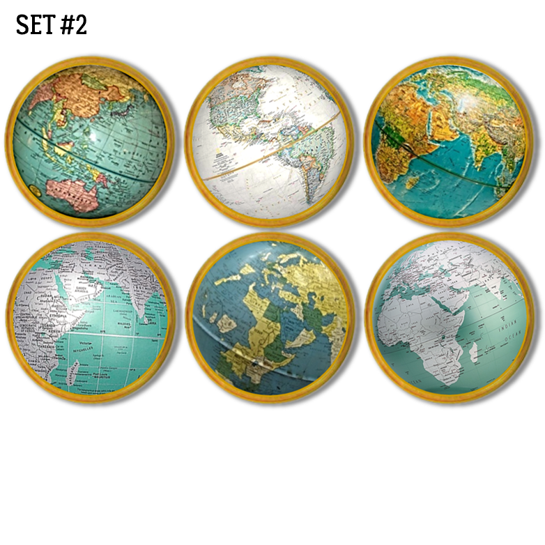 Handmade decorative cabinet knobs in a beautifully colored assortment of maps for an eclectic world globe geography theme. Ideal drawer pull hardware to add a subtle element of Wanderlust to your library, study or home office furniture.